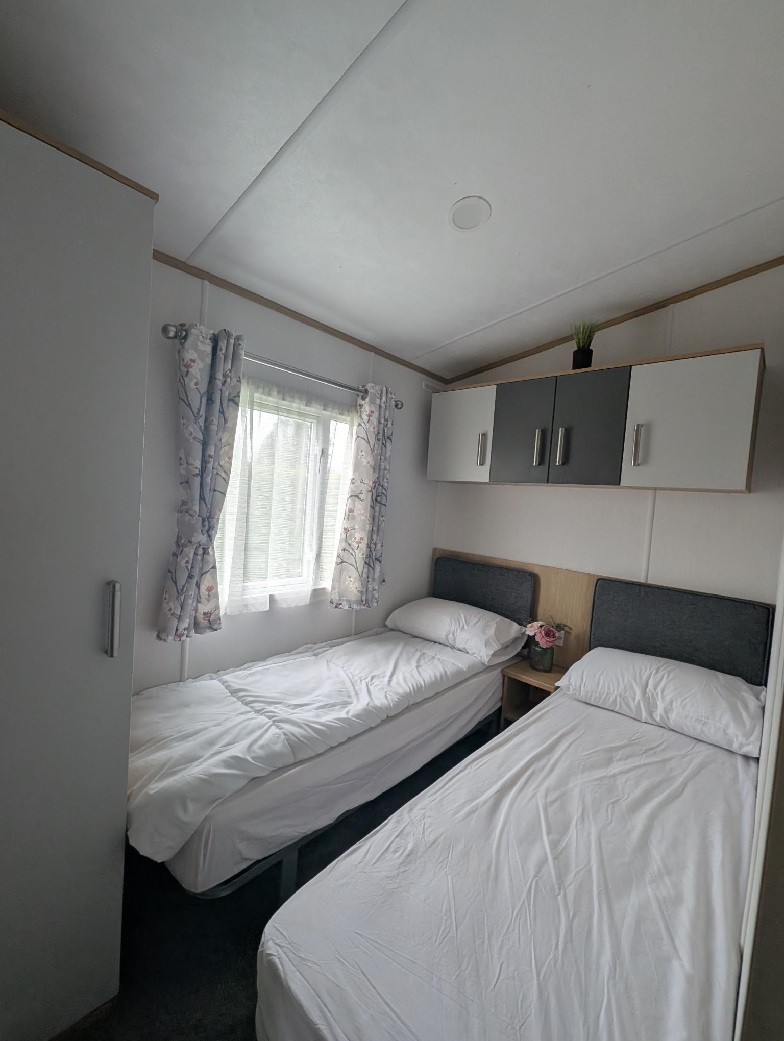 • Twin Bedroom: Twin beds; wardrobe and overhead storage.